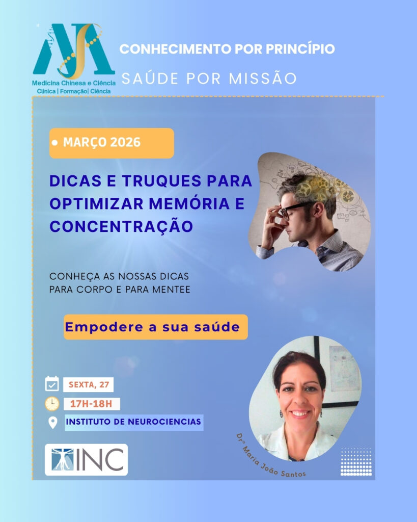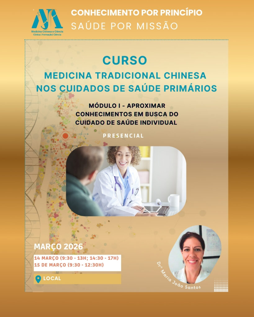 Brevemente Módulo 2 – Potenciais efeitos benéficos da MTC nos cuidados de saúde primáriosPromoção de bem-estar e melhoria no estilo de vida.Melhoria na qualidade de vida.Tratamento da dor e alívio de sintomas.Ação complementar em diferentes sintomas.Redução de ansiedade e stress.Técnicas e terapêuticas da MTC abordadas:AcupunturaMicrossistemas de acupunturaMoxabustão (estímulo térmico)VacuoterapiaTuina (massagem manual)Qigong (biofeedback vegetativo tradicional)FitoterapiaDietoterapiaHorário: 11 de abrilmanhã online 9:30 – 13htarde presencial 14:30 – 17:30DestinatáriosMédicos; Enfermeiros; Técnicos de diagnóstico e terapêutica. A Programa: BrA sessão terá lugar no dia 13.2.2026, pelas 17horas, no Instituto de neurociências e terá a duração de cerca de 1 horas.
