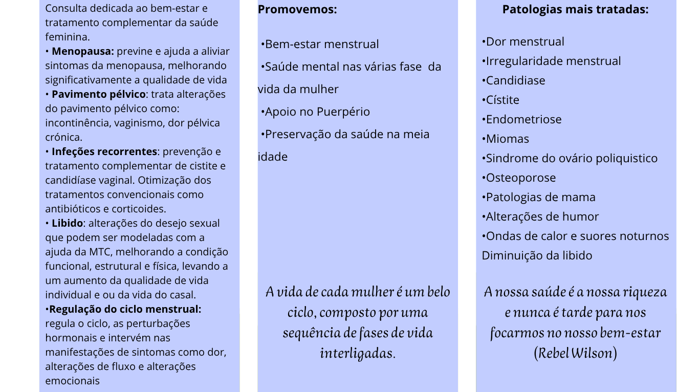 Consulta dedicada ao bem-estar e tratamento complementar da saúde feminina.