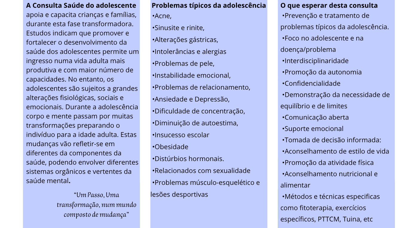 A Consulta Saúde do adolescente apoia e capacita crianças e famílias, durante esta fase transformadora. Estudos indicam que promover e fortalecer o desenvolvimento da saúde dos adolescentes permite um ingresso numa vida adulta mais produtiva e com maior número de capacidades. No entanto, os adolescentes são sujeitos a grandes alterações fisiológicas, sociais e emocionais. Durante a adolescência corpo e mente passam por muitas transformações preparando o indivíduo para a idade adulta. Estas mudanças vão refletir-se em diferentes da componentes da saúde, podendo envolver diferentes sistemas orgânicos e vertentes da saúde mental.